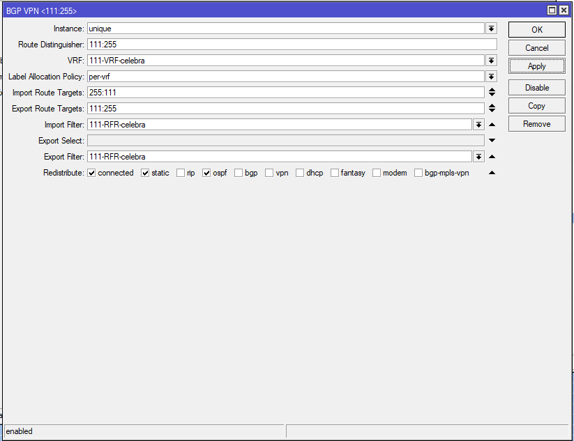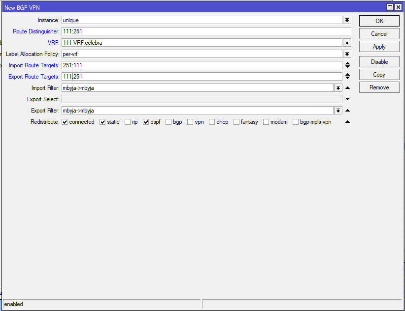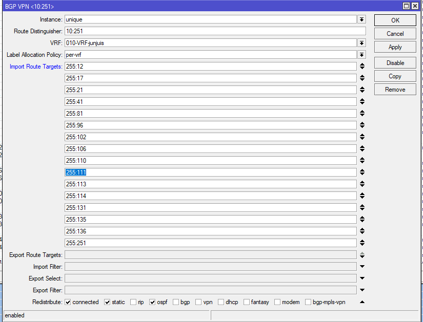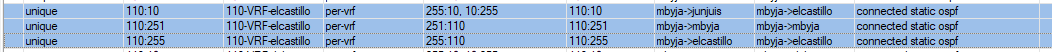 - En la regla con route distinguisher 10:251 (2) agregar import target 255:YY