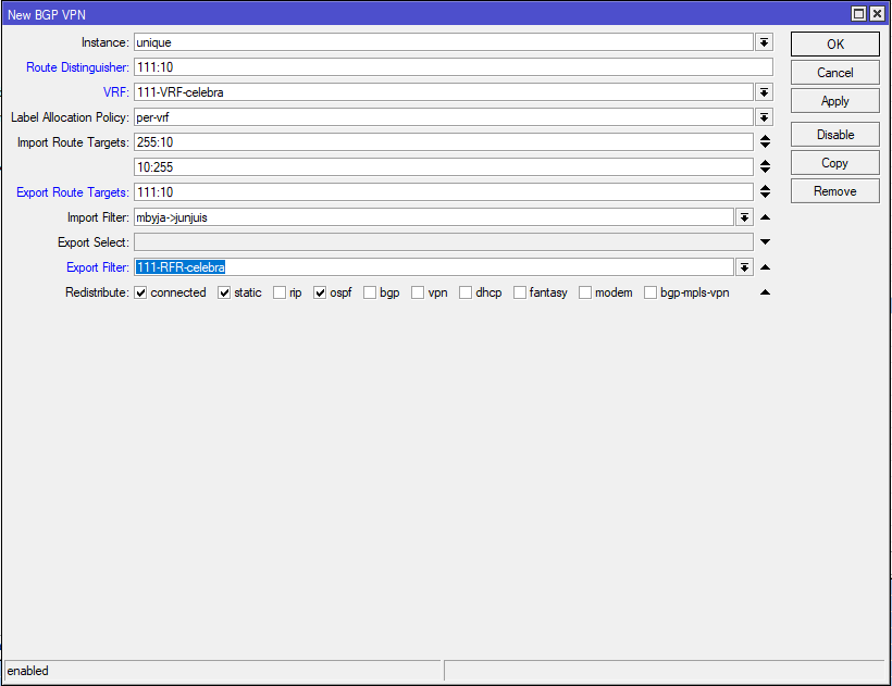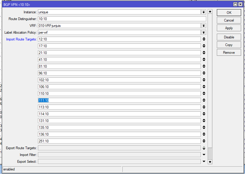 - En la regla con route distinguisher 10:10 agregar import target YY:10
