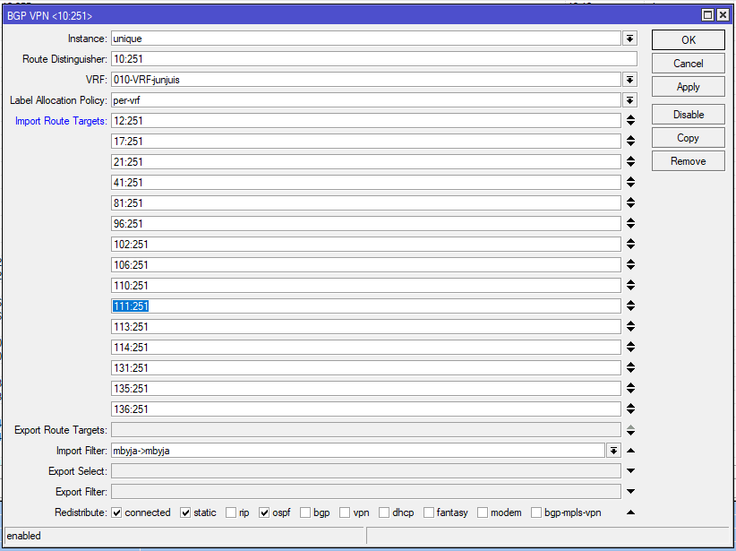 - En la regla con route distinguisher 10:251 (1) agregar import target YY:251