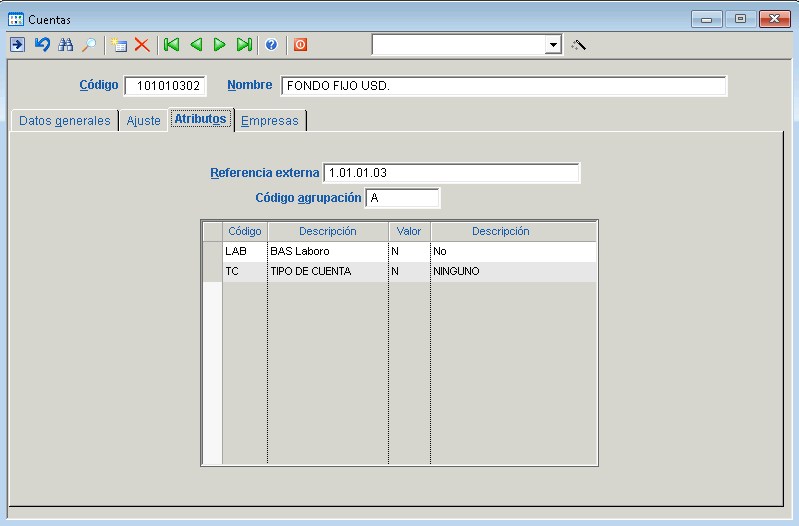 El código de selección (código de agrupación) se establece en la pestaña Atributos de la ficha de cuentas.