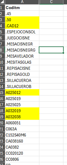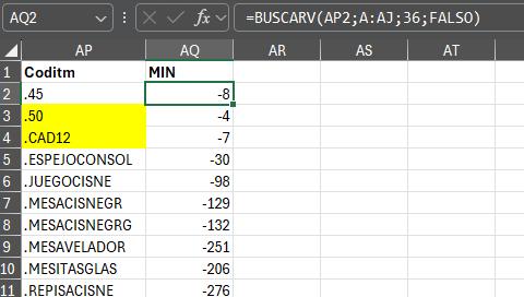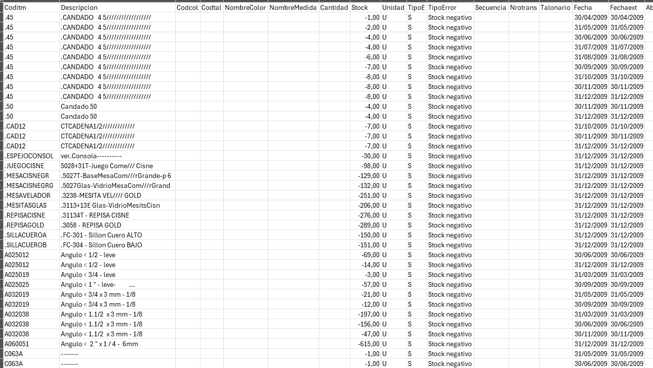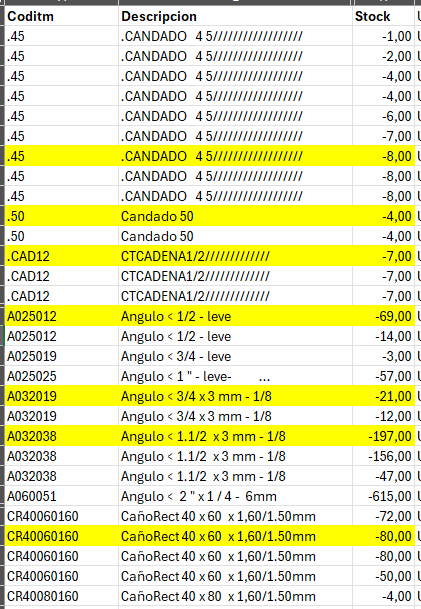 Abrir el archivo Excel generado y preparar de tal forma que quede una línea por código de producto. Esta línea debe de ser la operación con mayor stock negativo.