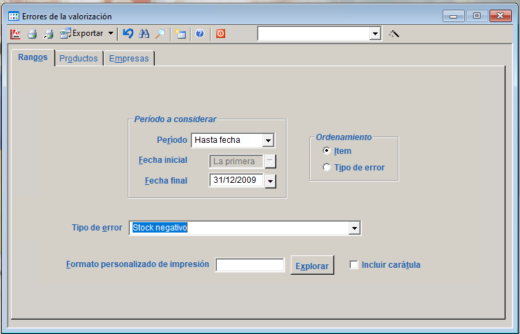 - Establecer periodo: hasta fecha e indicar la fecha de cierre del periodo en cuestión. Seleccionar en tipo de error: Stock negativo.