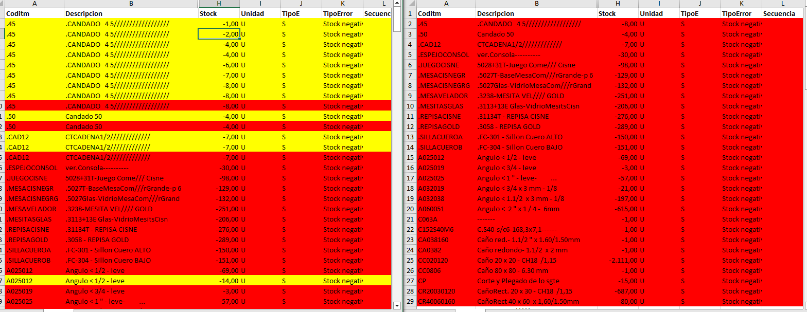 Debemos trabajar por la planilla de tal manera que quede 1 línea por código de producto. En el caso de que se detalle más de una línea por código, debe de quedar la cantidad más alta reportada por el informe de errores de valorización, de tal manera a simular el stock necesario para que no salten como errores ninguna de las operaciones con error por stock negativo.