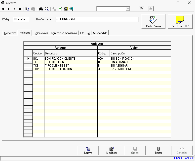 Buscamos el cliente, en este caso WEI TING YANG y si nos dirigimos a la pestaña Atributos podemos notar que atributo TOP - TIPO DE OPERACION está con el valor 3 - B2G - GOBIERNO el cual corresponde a instuciones publicas, el que corresponde a Agentes diplomaticos es 4 - B2F - EXTRANJERO de modo que solo basta con corregir esto y el comprobante se fiscalizará en la siguiente media hora o hora es decir el sistema hace intentos en intervalos de 30 min, por ejemplo si la hora actual es 10:15 la el proximo intento será las 10:30 luego las 11:00 y asi sucesivamente. Este dato es importante ya que en el intermedio como el sistema está intentando fiscalizar está a la espera de la respuesta de la SIFEN de modo que no siempre se visualizará el motivo de la no fiscalizacion, basta con esperar un poco y volver a entrar al Administrador FE nuevamente en unos minutos mas.