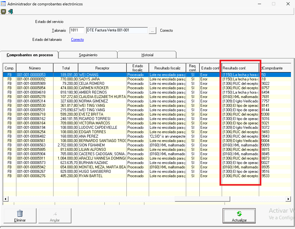 En la columna Resultado fiscaliz podemos ver el motivo por el cual no se fiscalizo el comprobante al momento de facturar, luego el sistema intenta en segundo plano fiscalizar el comprobante en forma recurrente cada 30 minutos, el resultaod de este segundo hilo de intentos se puede apreciar en la columna Resultado conf. Finalmente esta columna será la que usaremos para determinar el motivo de la NO fiscalización del comprobante.