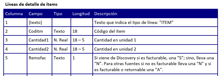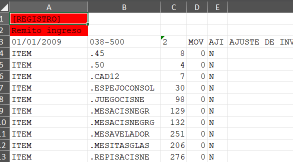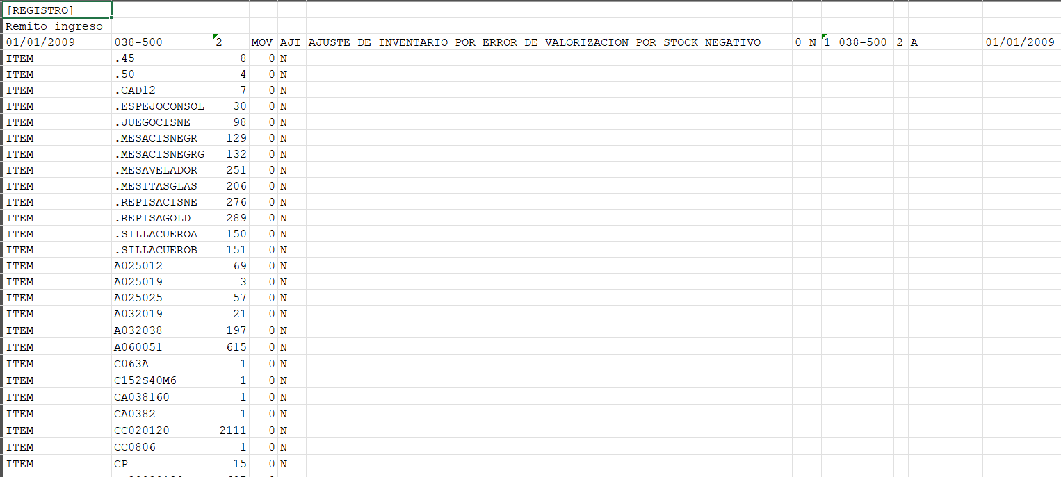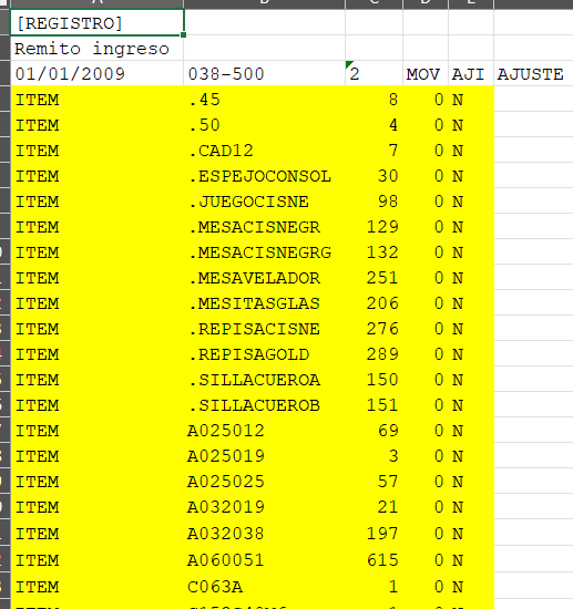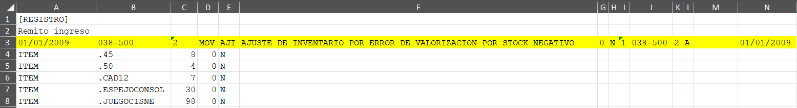 4. A partir de la cuarta linea son los registros de cada item con el stock a ajustar.