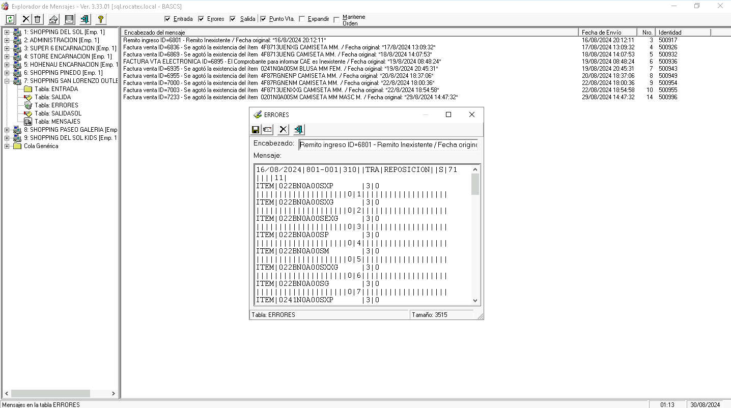 En caso de que en el explorador de mensajes del ICR encontremos mensajes con este error en la tabla de ERRORES de una sucursal se debe proceder a realizar el siguiente analisis, se debe abrir el mensaje, tomar nota del numero de remisión y verificar que no existe en el BASCS desde consulta de comprobantes. Tener en cuenta que para que haya un remito de ingreso primeramente debe existir un remito de egreso que se generó desde otra sucursal, debido a eso en la consulta de comprobantes buscaremos Egreso de mercadería y no Ingreso.