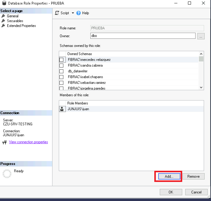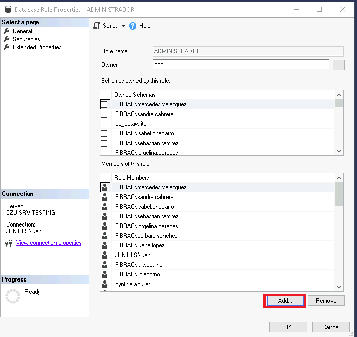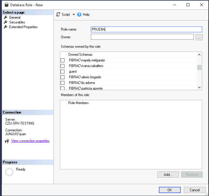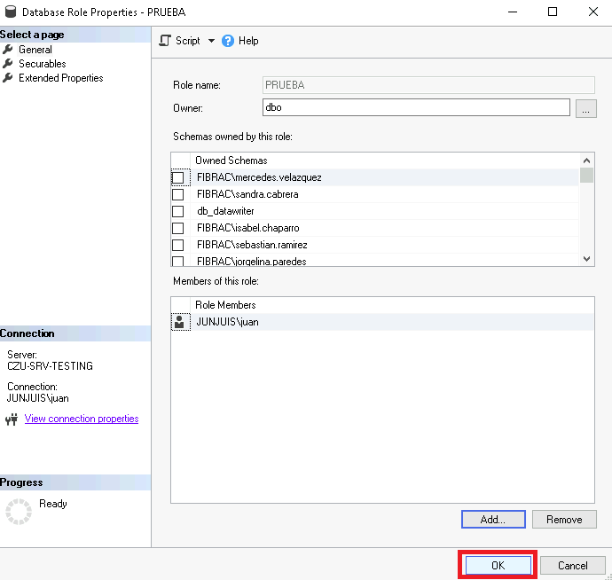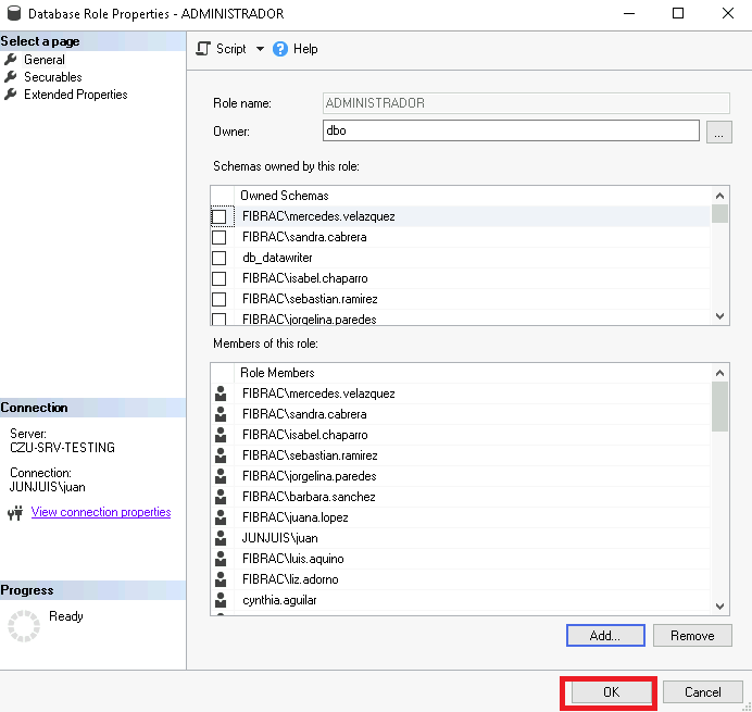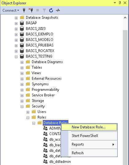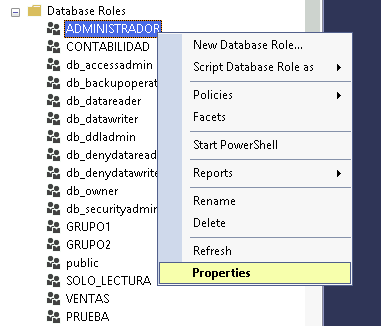 - Agregar el nuevo rol creado, a alguno de los roles por defecto (ADMINISTRADOR, GRUPO1, GRUPO2, SOLO_LECTURA). Clic derecho en el rol, propiedades.