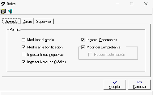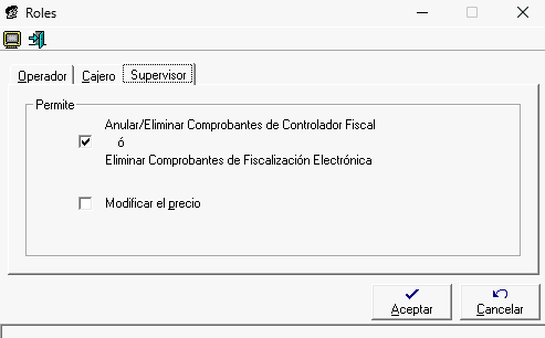 Supervisores: A lo mencionado en cada rol anterior es comun en ambas supervisiones la posibilidad de anular comprobantes, eliminar comprobantes, modificar precios. Estas atribuciones son intrincecas pero se pueden marcar o desmarcar de acuerdo a la necesidad.