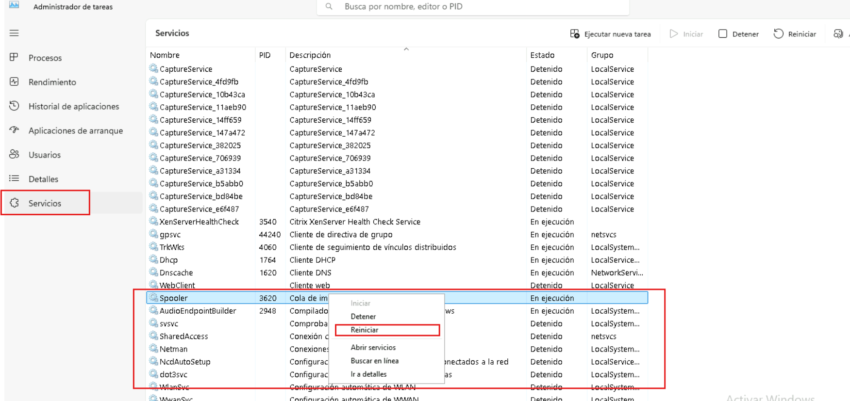 Paso cinco: ingresamos a administrador de tareas, accedemos a servicios y reiniciamos el servicio cola de impresion o "spooler"