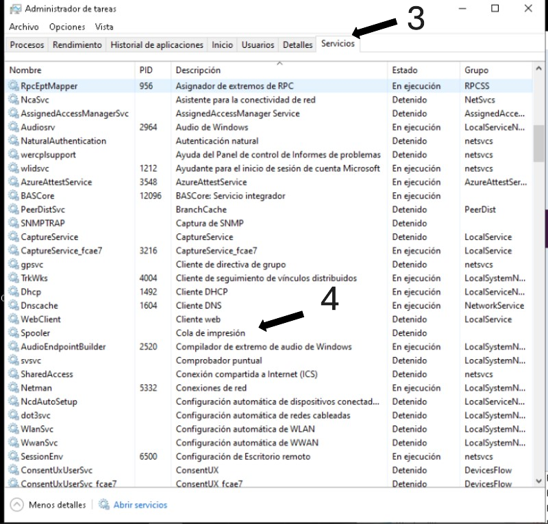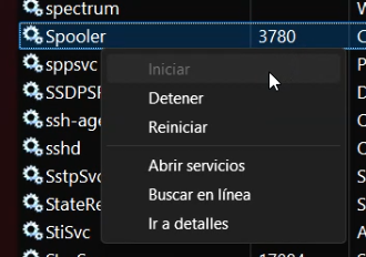 4. Buscamos el servicio "cola de impresión" o "Spooler"
