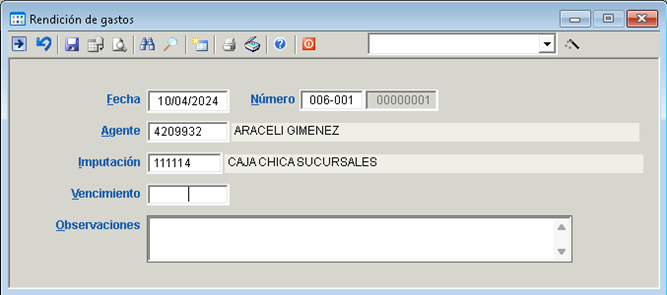Crear una nueva rendición ingresar los datos como se muestra en la imagen, asignándola al agente encargado de cargar los gastos. Finalmente grabar con F10 o el boton de la flecha.