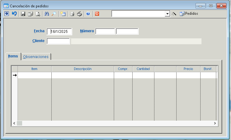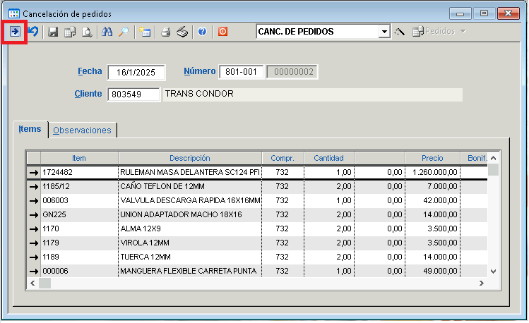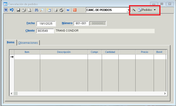 Una vez ingresado el código del cliente cuyo pedido se desea cancelar, en el margen superior a la derecha dar clic con el mouse sobre la texto pedidos, inmediatamente esta te ofrecerá los pedidos pendientes para el cliente ingresado.