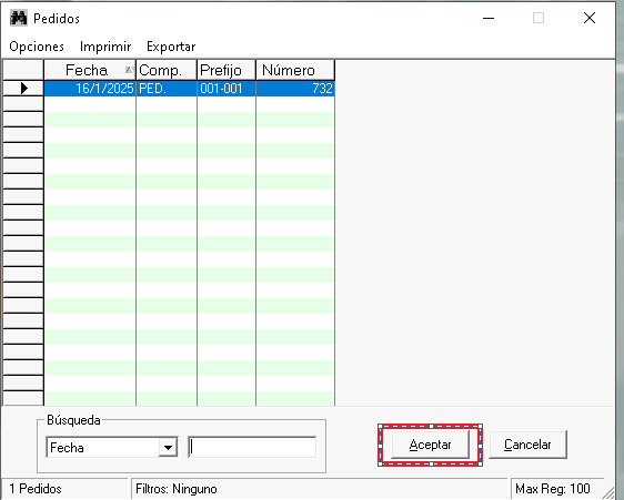 En la ventana emergente dar clic al pedido que se desea cancelar que el sistema le sugiere según cliente asociado y luego aceptar