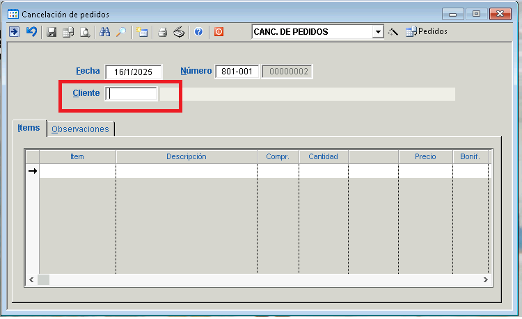 Seleccionar el modelo por defecto CANC. DE PEDIDOS. E ingresar el código del cliente cuyo pedido de venta se desea cancelar en la ventana asignada para dicho efecto