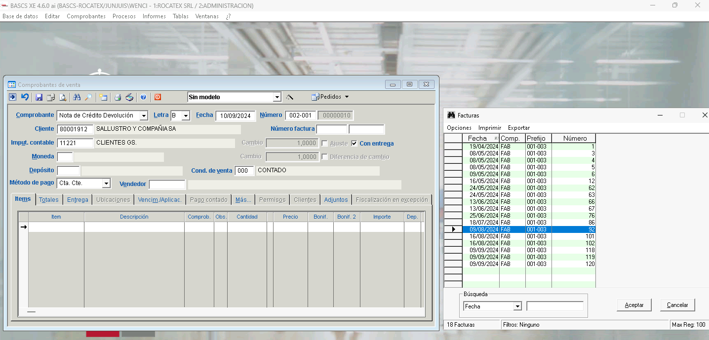 En el ejemplo de abajo se puede ver que una vez seleccionado el comprobante Nota de Crédito Devolución la letra B y el talonario correcto se debe ingresar el cliente y una vez ingresado este datos se puede avanzar hasta el campo Número factura donde se debe seleccionar la factura a afectar mediante la busqueda en la lista desplegable que se visualiza utilizando la tecla F3 o el boton de buscar.