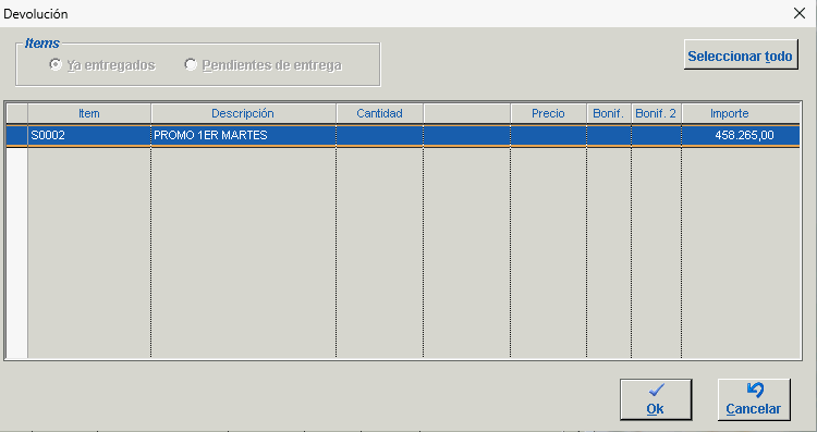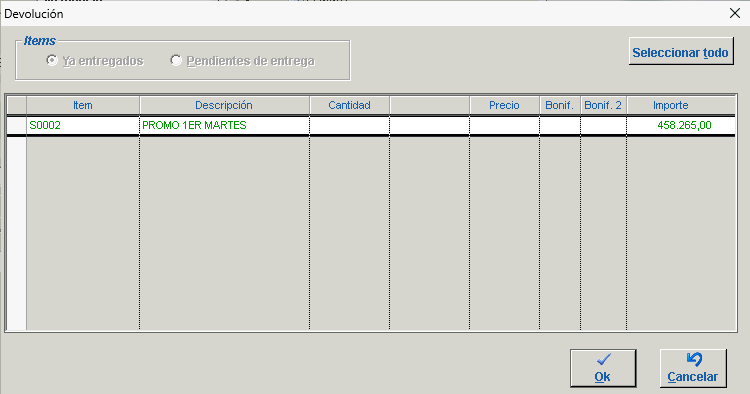 Donde podemos seleccionar las lineas que deseamos devolver ejecutando doble click sobre las mismas, una vez seleccionadas, las letras se tornarán de color verde indicando que las mismas serán agregadas al detalle de la Nota de Credito. Finalmente click en Aceptar.