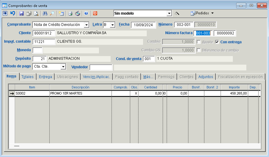 Finalmente se debe avanzar a registrar los datos del pago como en cualquier comprobante de venta para los casos en que el comprobante de origen sea al Contado, en caso de que el comprobante de origen sea a Crédito el circuito termina grabando directamente el comprobante mediante la tecla F10 o el boton grabar.