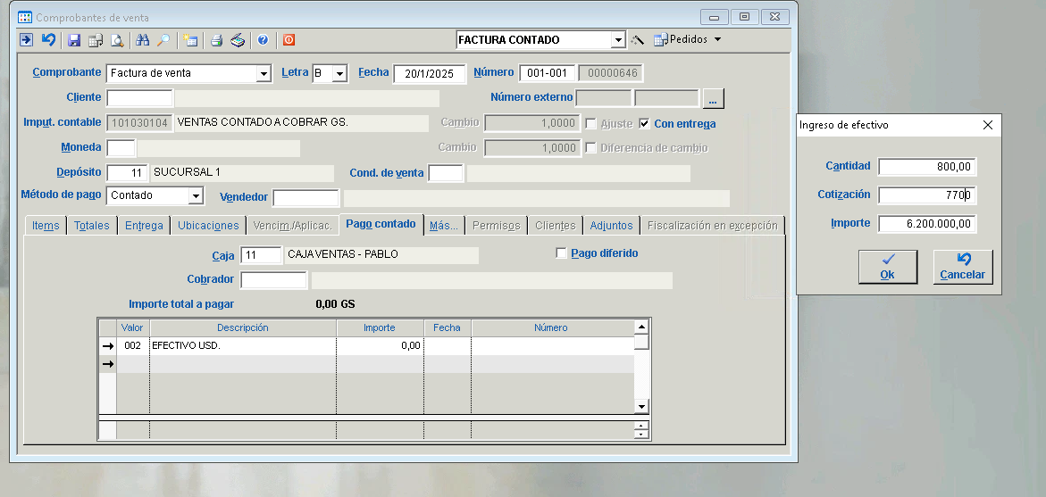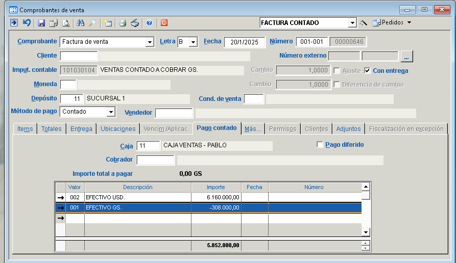 como el vuelto que vas a entregar va ser monedas guaranies se deberá cargar un ítems de monedas guaranies con monto negativo como figura en la imagen de abajo